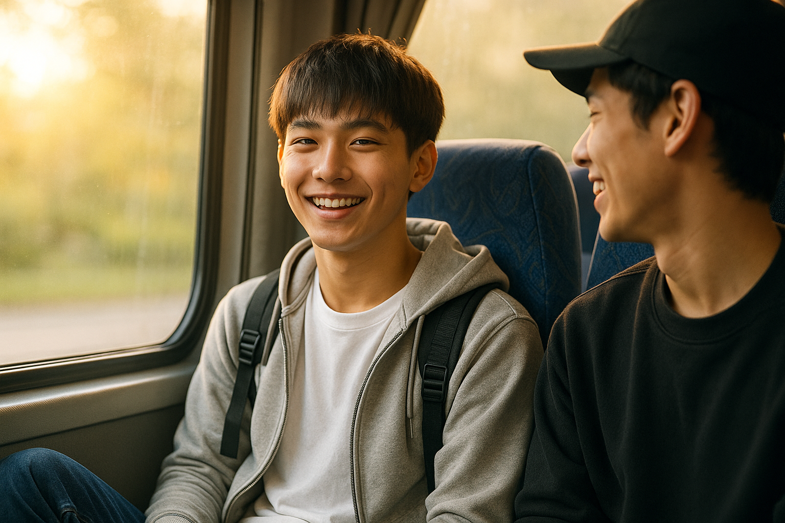 バスの窓から差し込む朝の光。仲間と「今日の服これでいい?」と笑い合いながら始まる修学旅行の朝は、特別な時間です。