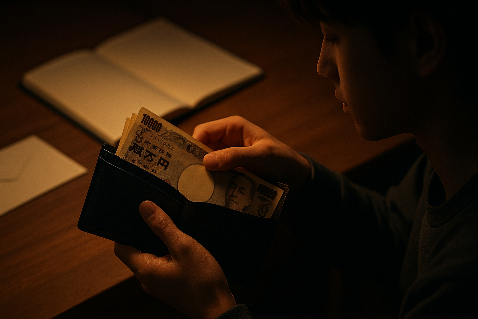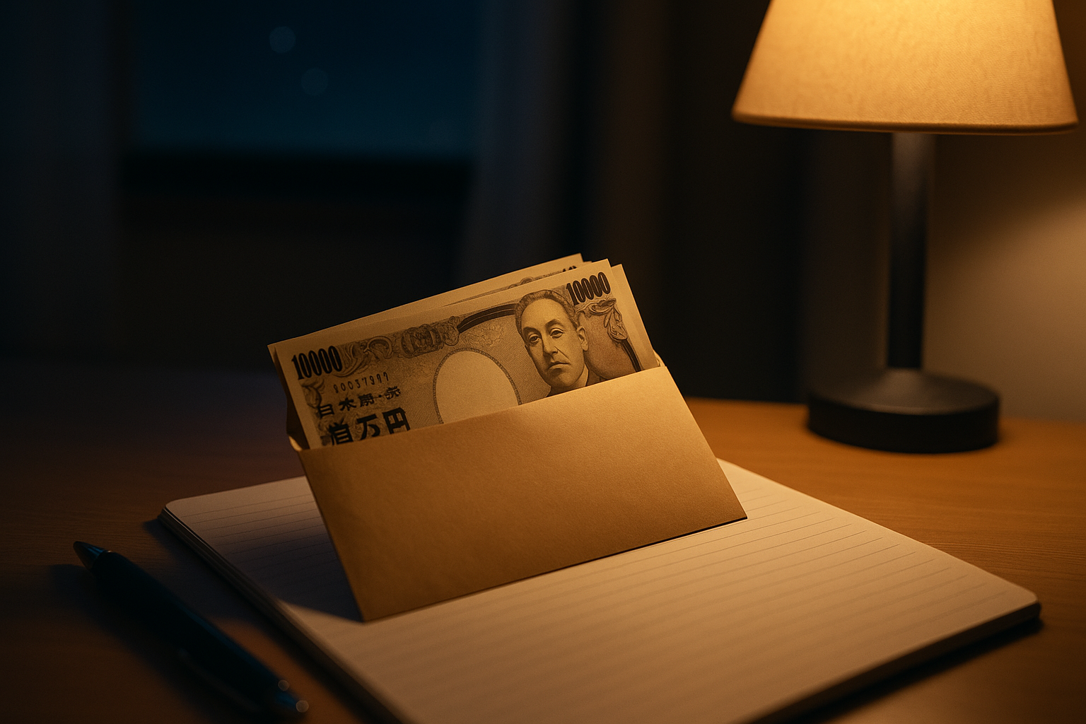 夜の勉強机。封筒の糊を切ると、きれいに揃えられたお札が、まだ見ぬ明日への切符のように静かに光る。
